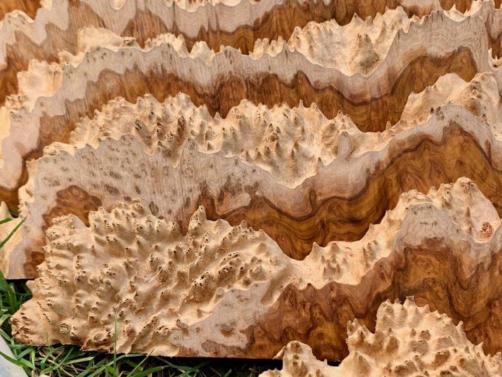 Hybrid casting has become ubiquitous. But the coolness of the exterior spikes aside, let's face it, everyone wants to see what's "inside" to get some sense of the color and figure. I get it. So I trim and strip cut certain burls, whose shape or the presence of a cut edge may not make it an ideal candidate for turning, but great for casting (with the added benefit of standard solid burl blanks and a lower price point than dimensional stock). I typically cut in widths of 1", 1-5/8" or 1-3/4", but if there's a burl you'd like cut in a different width(s), I'd be happy to do so. There is no charge for doing so, providing you purchase the entire burl. Alternatively, take a look at the Cutoffs page, which, depending on what you're looking to do and the cutoff lot of interest, may be a more cost effective option.